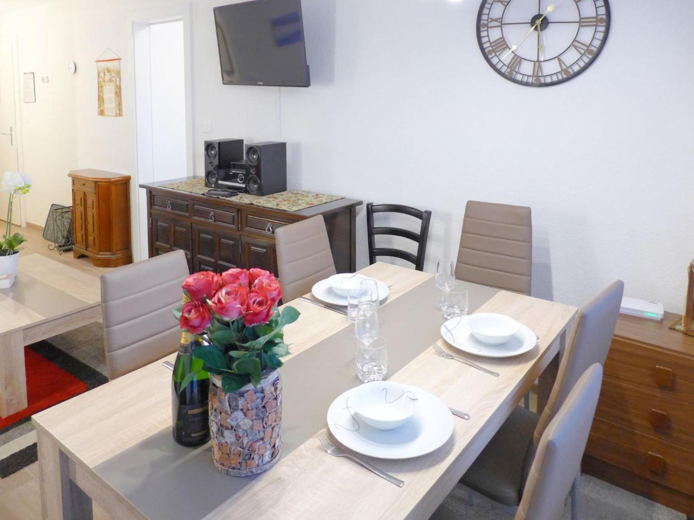 Apartment. 2-room apartment on 3rd floor: livingdining room with 1 double sofa bed (140 cm), cable-TV. 1 room with 1 double bed (140 cm). Kitchen (oven, dishwasher). BathWC. Balcony, south facing position and, east facing position. Access via the B2 entrance.
